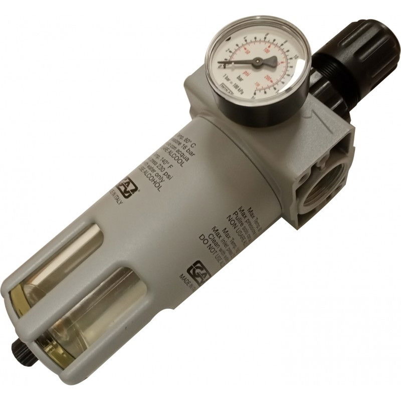 A sűrített levegős hálózatba építhető 1" szűrő-szabályzó, vízleválasztó egység centrifugál elvű szinterszűrővel van ellátva. A vízleeresztés kézi működtetésű.